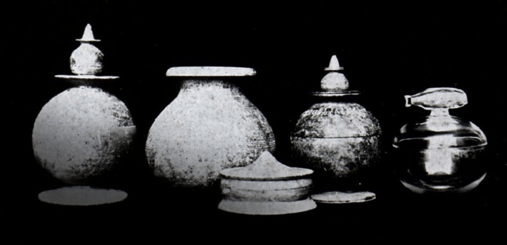 The Mallas honour the body of the Buddha with dance, song, music, garlands, and perfume for a whole week. Then they take the body out the east gate to the Mallas’ shrine at Makuta-Bandhana, possibly a hall. Meanwhile, Mahakassapa, the Buddha’s foremost living disciple, is travelling when he hears of the Buddha’s passing and makes his way to Kusinara, arriving just in time to witness the cremation. They cremate the Buddha’s body and, amidst some bickering, divide the relics into ten parts, which they distribute to various groups who support the Buddha and his teaching. These sites of great stupas continue to receive veneration and pilgrimage today. In the late 19th century, Wiliam Peppé discovered one of these relic depositories, which many believe to have contained at least a part of the mortal remains of the Buddha.