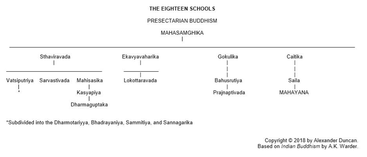 Over the next 300 years, numerous schools and sects emerged, often based on geographic divisions, leading to what are traditionally known as the Eighteen Schools. These schools represent the ways that early Buddhism developed, split, and adapted to different local contexts. The names and doctrines of these schools vary across sources, but for the purposes of this talk, I will be referencing a list compiled by A.K. Warder, a prominent scholar of Indian Buddhism. In his book Indian Buddhism (3rd revised edition, 2000), Warder provides a list of eighteen schools in approximate chronological order, reflecting the state of Buddhist thought around 50 BCE.
