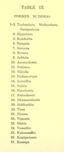 [3] The Nidanakatha is translated in its entirety as “The Story of the Lineage” in T.W. Rhys Davids, Buddhist Birth-Stories (Jataka Tales): The Commentarial Introduction Entitled Nidana-Katha, the Story of the Lineage, rev. ed. (London: Geo. Routledge, ca. 1913?), pp. 81—232. According to M.S. Bhat the Nidanakatha dates from the 2nd century BCE (ed., The Genealogy of the Buddhas, trans. M.V. Talim, Devanagari-Pali Text Series No. 15 (Bombay: University of Bombay, 1969), p. xiv).