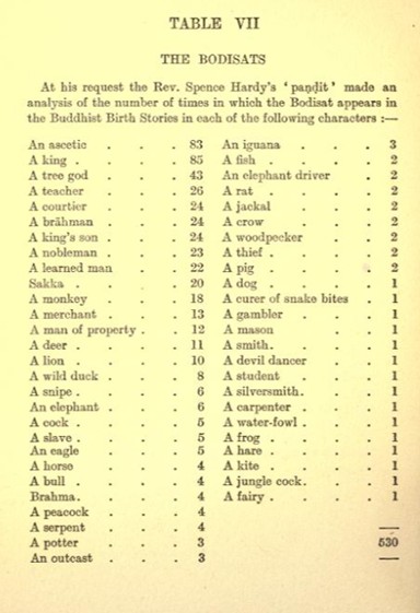 The kinds of rebirths described in the Jataka tales are diverse. The following table gives the number of births of the Bodhisattva of each kind, which are also representative of the generality (although the Bodhisattva is usually presented as a wise, righteous, and compassionate leader), based on the table produced by Spence Hardy’s pandit and reproduced in Buddhist Birth-Stories.